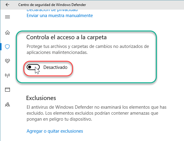 A continuación veremos cómo acceder a esta nueva función, como activarla y desactivarla, así como agregar o quitar carpetas a la supervisión de manipulado y como autorizar y desautorizar aplicaciones.